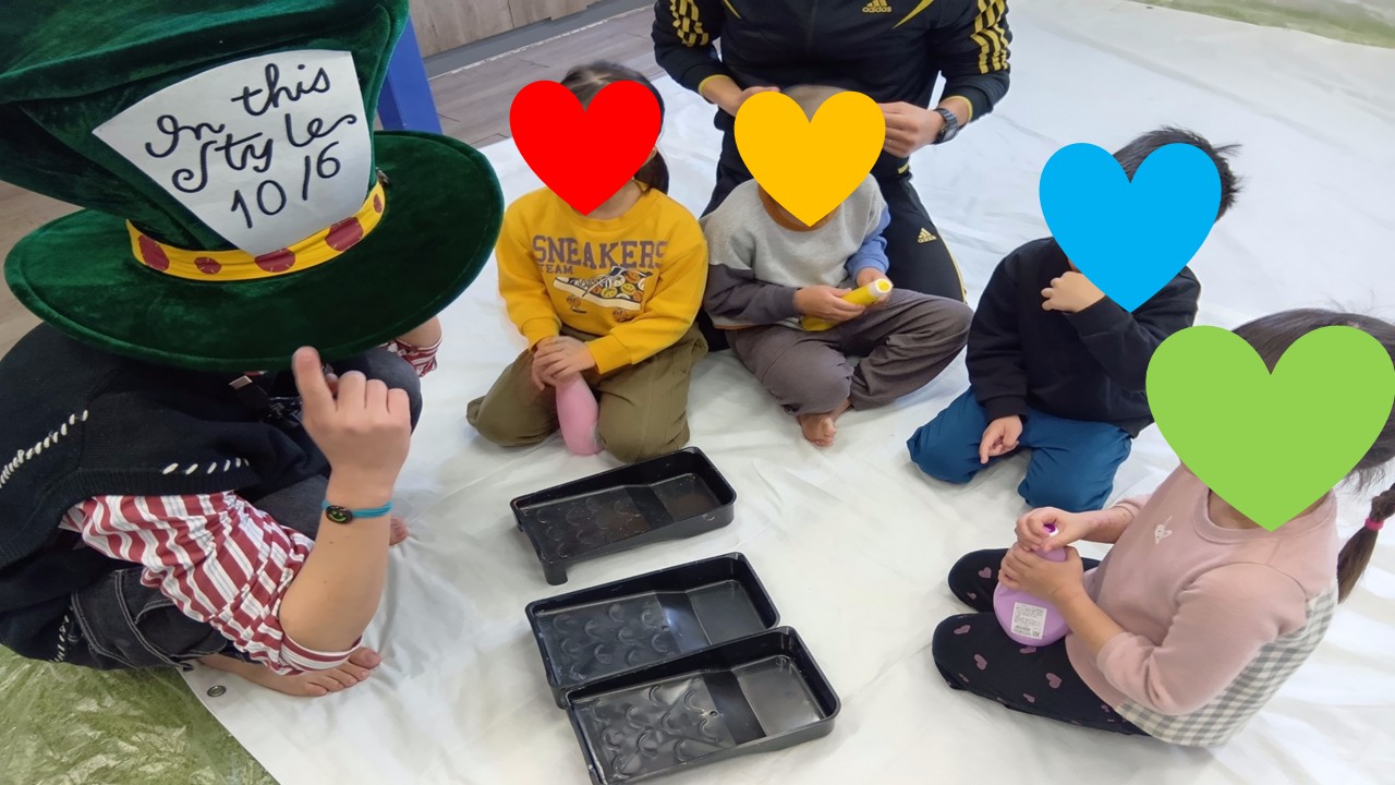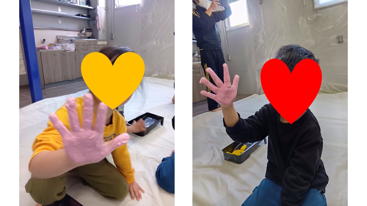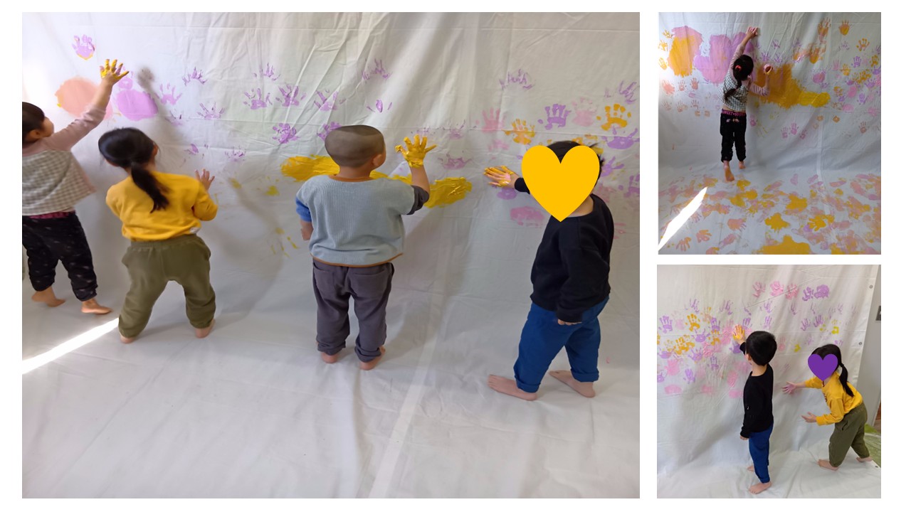 手や腕、洋服にも絵の具がつく、全身ペイントあそびならではのダイナミックな活動になりました。少しドキドキしながらも、「ついちゃった!」「おそろいの色だね」と笑い合いながら、汚れることも気にせず、思いきり表現を楽しむ様子が印象的でした😊