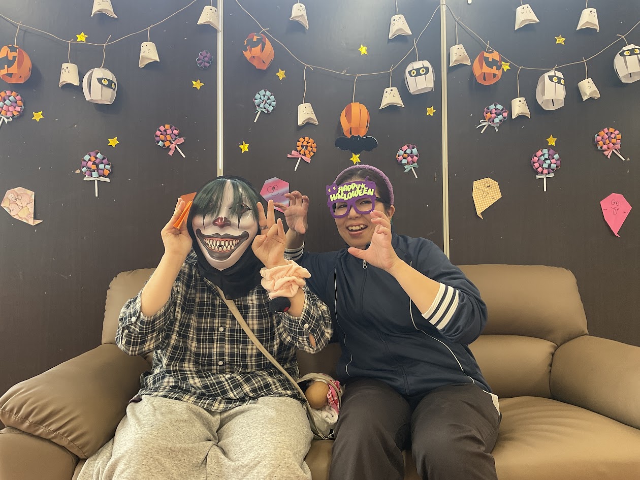 かわいいカチューシャやこわーい被り物を被って写真を撮って