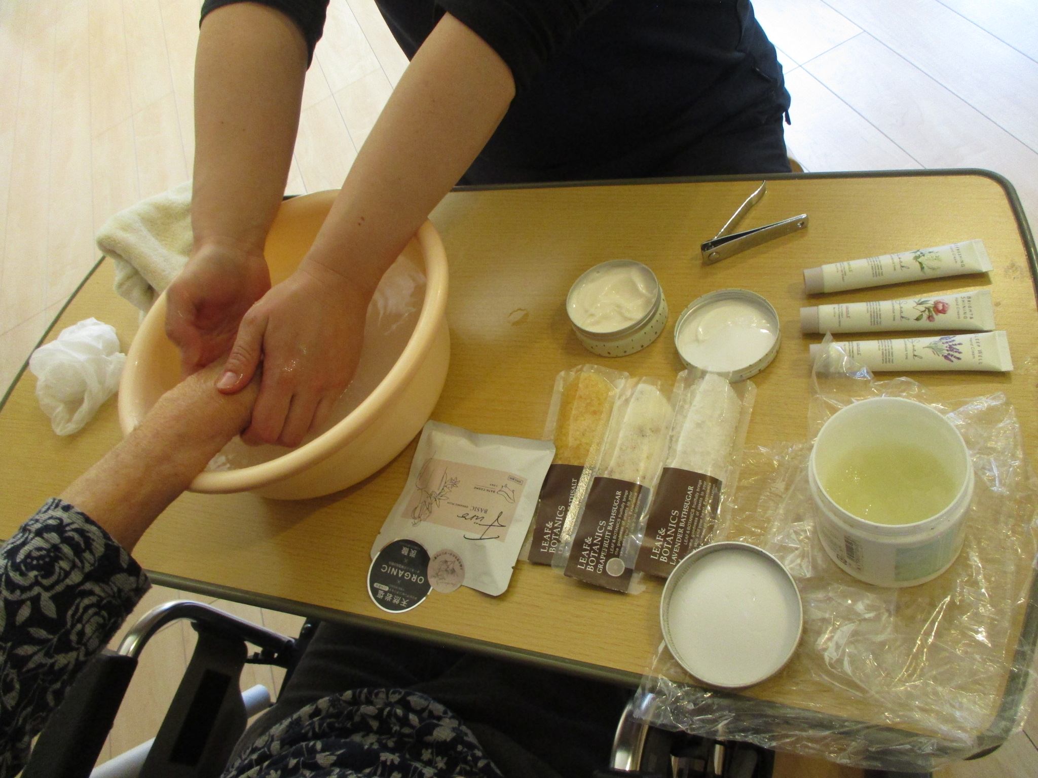 洗い流した後は、温かいお湯で手浴を行いました。仕上げにバラやラベンダー等、お好きな香りのハンドクリームで保湿してしっとり素肌に😌🌸。