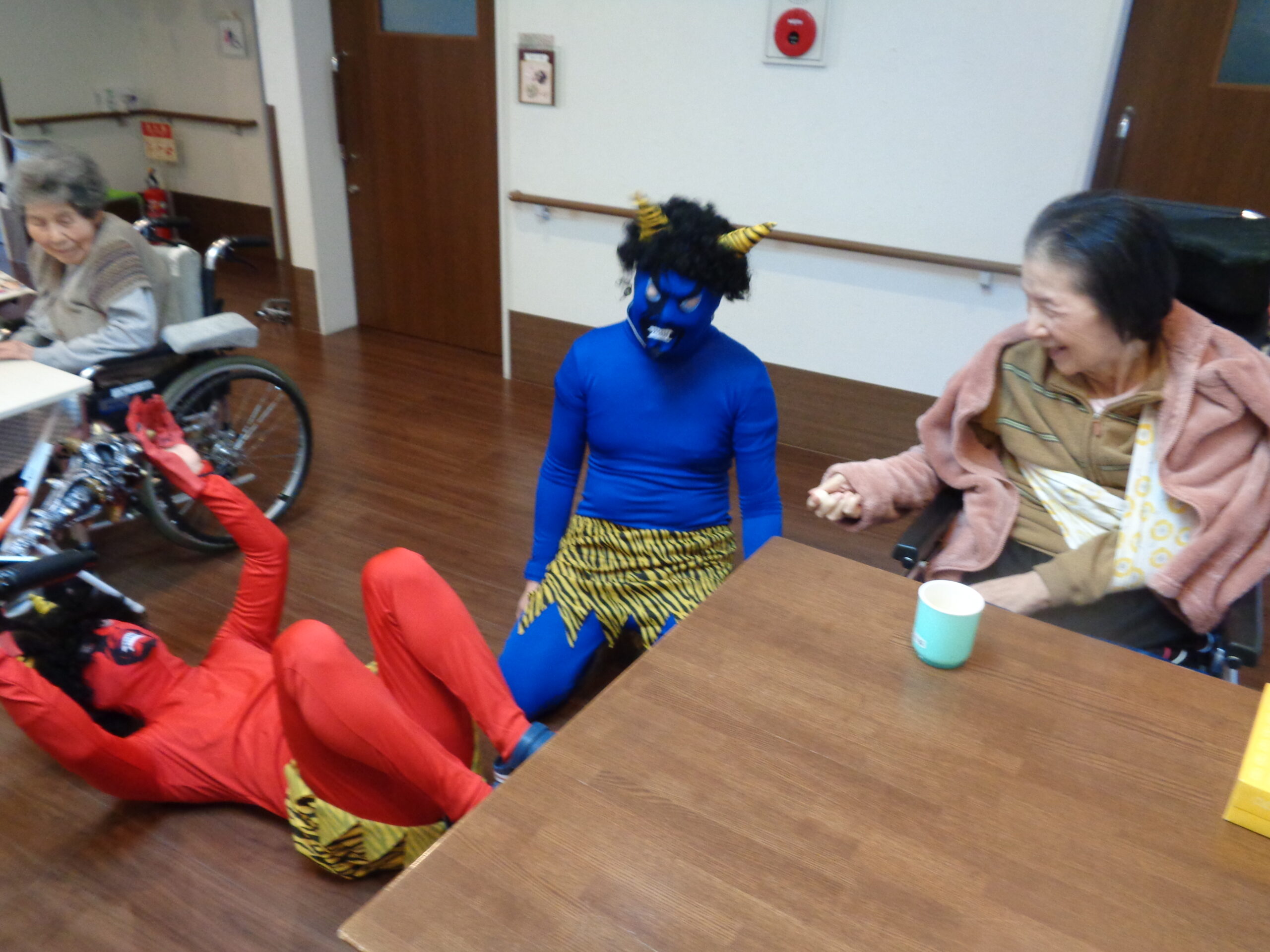 節分の日に、豆まきをしました。入居者の方のもとに鬼が襲来👹!
