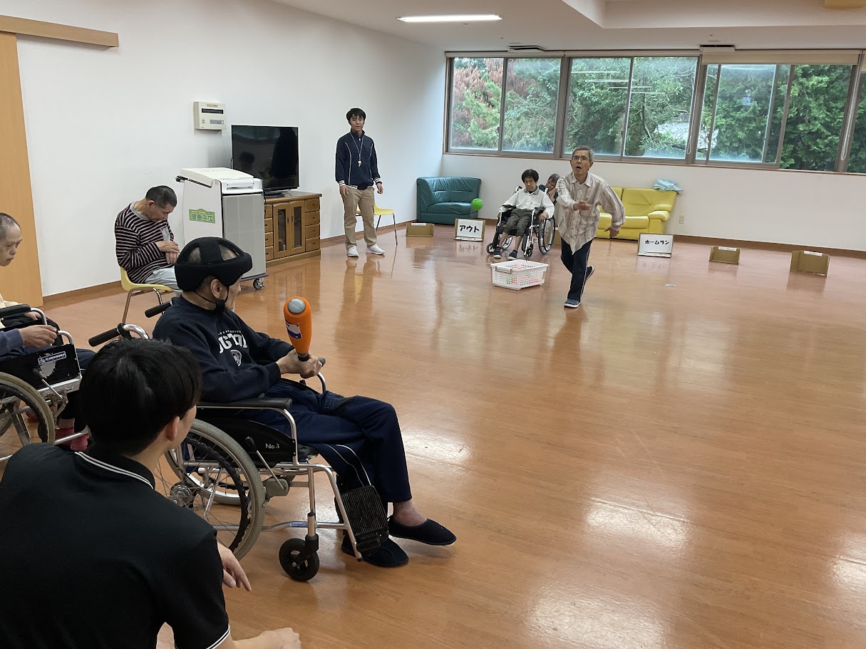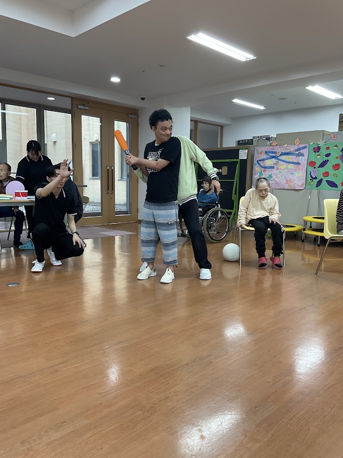 バットを振る事か難しい方は職員が一部手伝いを行いつつも